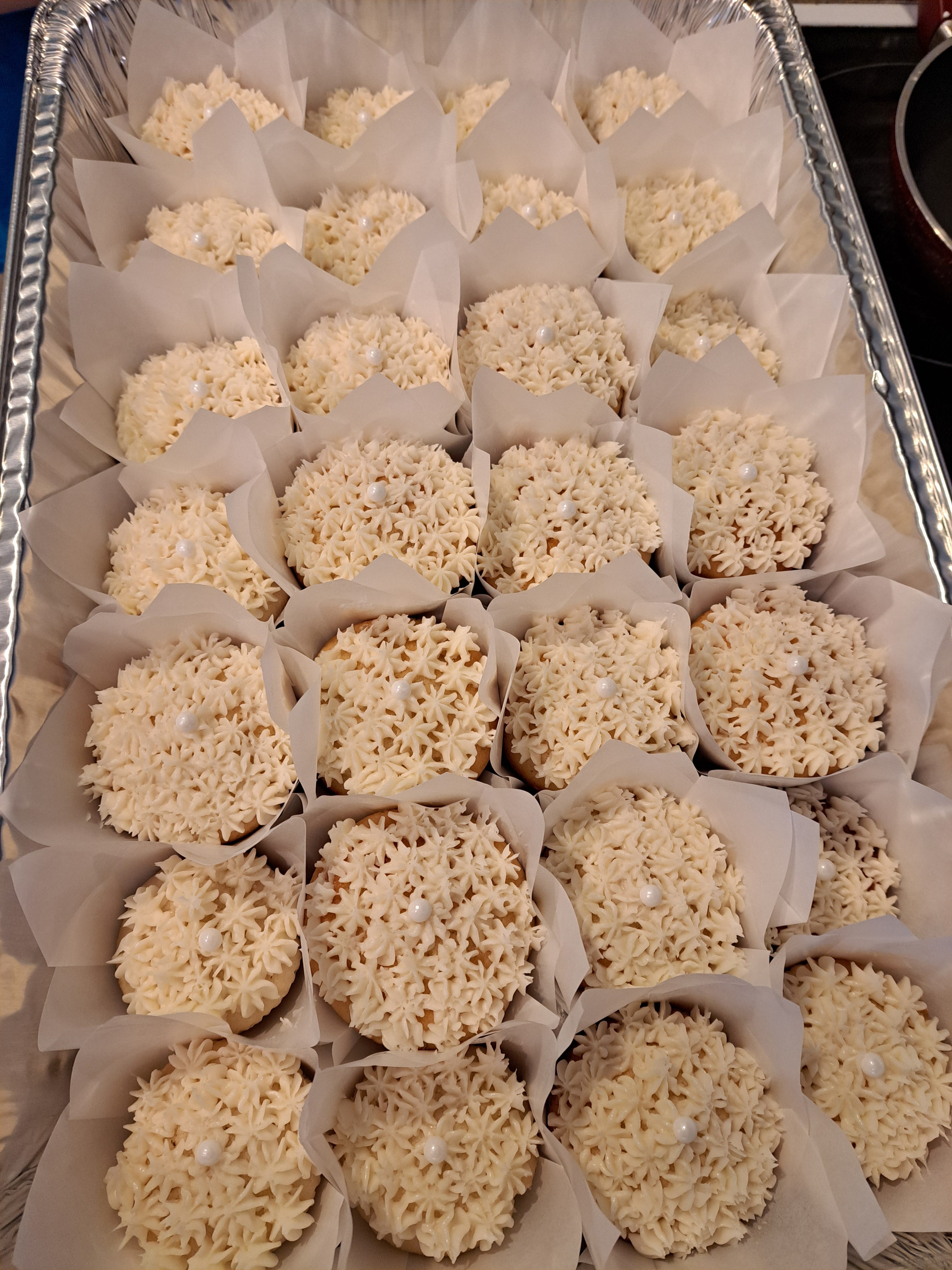Also, this week, I was asked to make cupcakes for a baby shower and decorate them with little stars of icing. The frosting gun and tip made my work easier, but it still took a labor of love to cover each little cupcake with myriads of tiny stars.